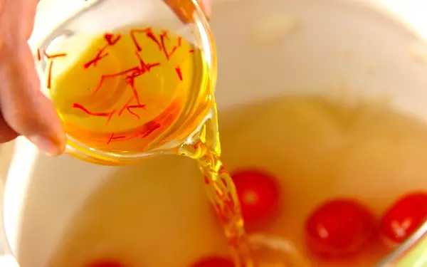 2、プチトマト、水、サフランをもどし汁ごと入れ、中火で10~12分煮る。