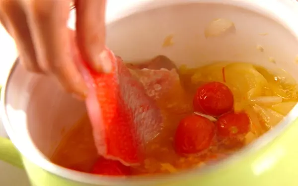 3、金目鯛を加えて5~8分煮、塩、コショウを加える。器に盛り、イタリアンパセリを添える。