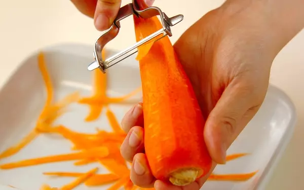 1、ニンジンは皮をむき、ピーラーで縦にスライスする。甘塩タラはザルにのせ、熱湯をまわしかけて臭みを抜く。