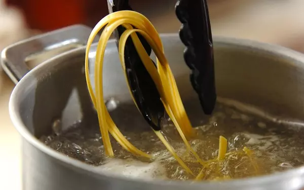 2、たっぷりの湯に塩14gを入れ、パスタをゆでる。袋の表示時間の1分前にザルに上げ、水気をきる。