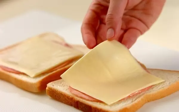 1、食パン2枚にハム、スライスチーズをのせ、残りの2枚でそれぞれをはさむ。