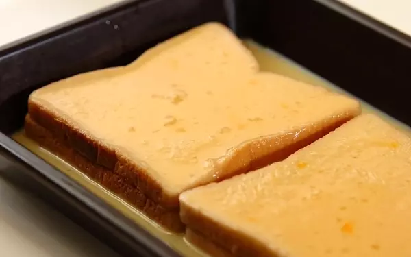 2、<卵液>の材料を砂糖が溶けるまで混ぜ合わせ、(1)を浸して、フライ返しで裏返しながらまんべんなくしみこませる。