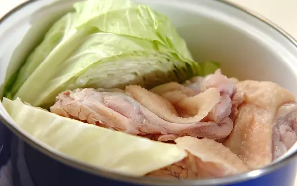 1、鶏もも肉は半分に切り、フォークを全体に刺して塩少々をもみ込む。キャベツは半分のくし切りにする。ジャガイモは皮をむいて半分に切り、水に放って白濁したら水気をきる。ニンジンは皮をむき、半分に切る。ローリエはちぎり、粒コショウと共にお茶パックに詰める。