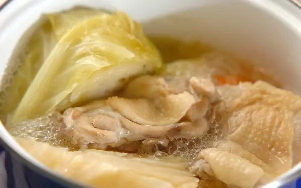 ブイヨンを使わなくても、野菜と鶏肉から出るダシだけで味付けは十分!一度冷ますことで、スープの旨味が具材に染み込み、さらにコクが深まります。