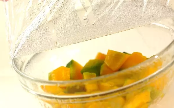 ・カボチャは種と皮を取り除き、ひとくち大に切って耐熱容器に入れ、ラップをかけて電子レンジで4~5分加熱してやわらかくしておく。