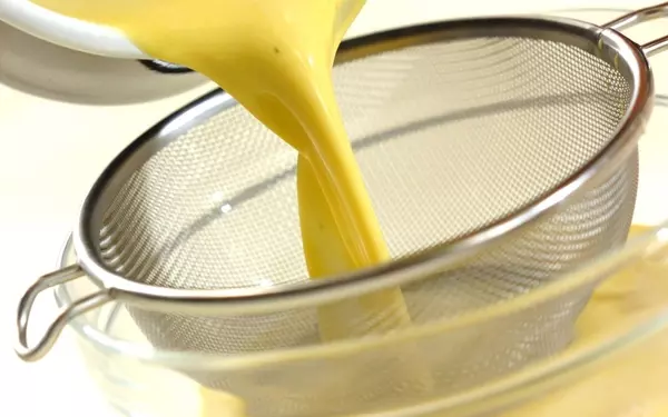 3、板ゼラチンの水気をきって(2)に加えて混ぜ溶かす。網でこし、氷水にあてて粗熱を取り、器に流し入れて冷蔵庫で冷やしかためる。