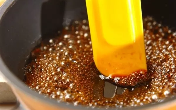 2、小鍋にアルミホイルの肉汁と<タレ>の材料を入れて、中火で加熱する。沸騰したら、トロミがつくまで煮詰める。