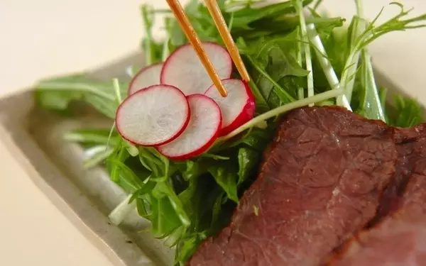 3、水気をきった水菜、ラディッシュ、ローストビーフを器に盛る。<タレ>をかけ、練りワサビを添える。