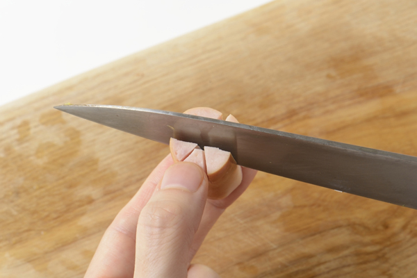 5)ウインナーは1本を横3等分に切って片方の切り口に放射線状に1cmほど切り込みを入れる。