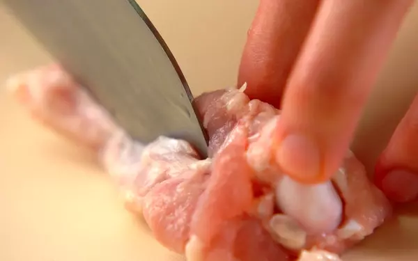 1、鶏手羽元は、フォークで全体を刺して、骨に沿って3本切り込みを入れる。抗菌袋に、リンゴと共に入れて30分以上置く。