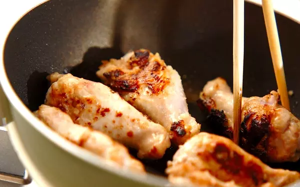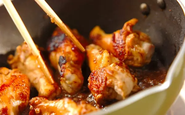3、抗菌袋に<タレ>の材料を入れて、フライパンに流し入れる。トロミがつくまで煮詰め、鶏手羽元にからめる。