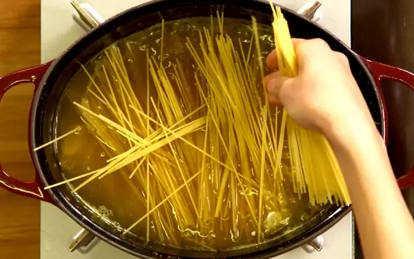 2、食べ終わった後の残ったスープに、スパゲティーを半分に折って入れ、袋に書かれた時間通りにゆでる。火を消して、残ったスープは捨てる。