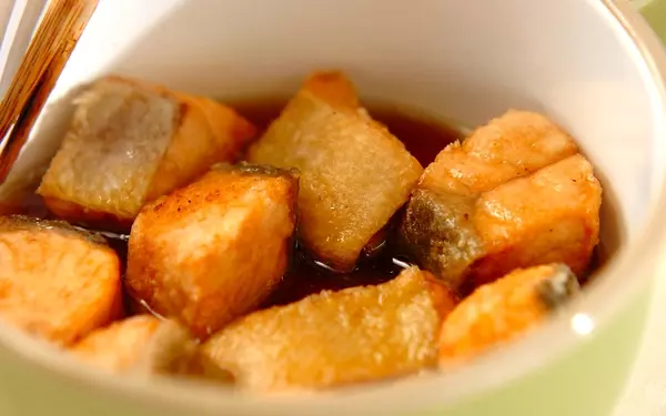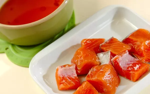 1、生鮭に片栗粉をまぶし、170℃の揚げ油で揚げ、熱いうちに<漬けダレ>に漬ける。