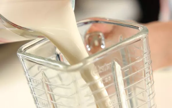 2、練り黒ゴマ、豆乳、ご飯をミキサーに入れてかくはんし、鍋に移して砂糖と塩を加えて中火で温める。