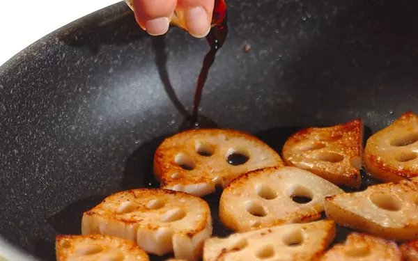 3、しょうゆを鍋肌にまわしかけ、レンコンにからめる。粗びき黒コショウを振り、器に盛る。