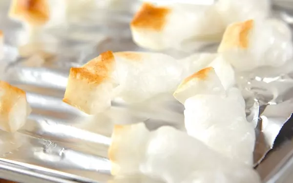 ・角餅は1個を6等分し、トースターで薄く焼き色がつくまで焼く。