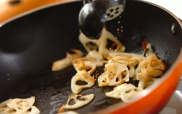 1、レンコンは皮をむいて薄くイチョウ切りにし、オリーブ油でサッと炒め、粗びき黒コショウを振る。