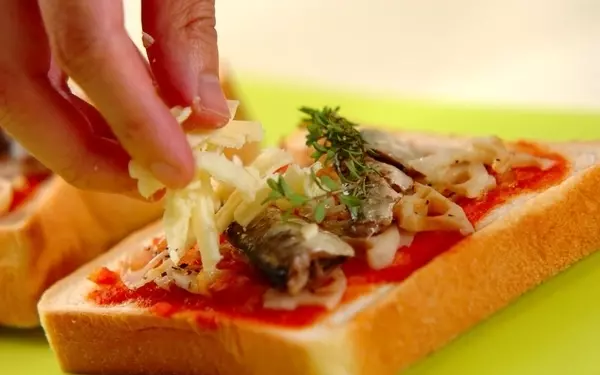 2、食パンにトマトソースをぬり、1枚に(1)のレンコンの半量、オイルサーディン2尾、タイム1枝をのせ、最後にチーズをのせる。