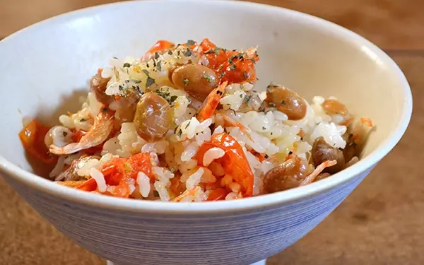 コンソメ味のごはんに、炒り大豆の歯触りを感じ、満足感があります。よく噛んでしみじみ味わうごはんです。