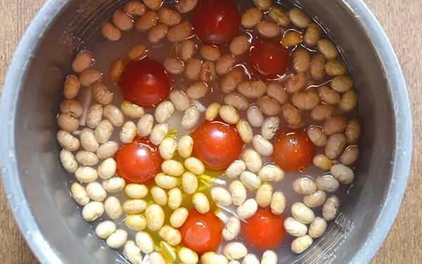 3、ミニトマトのへたをとって並べ、炒り大豆、にんにく、オリーブオイル、刻んだ固形スープの素を入れて普通に炊く。
