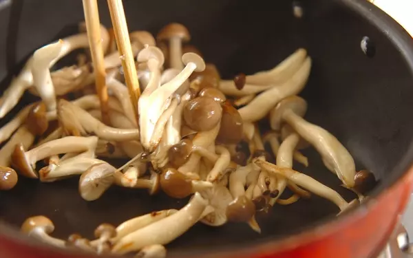 2、フライパンにサラダ油を熱し、中火でシメジをしんなりするまで炒める。