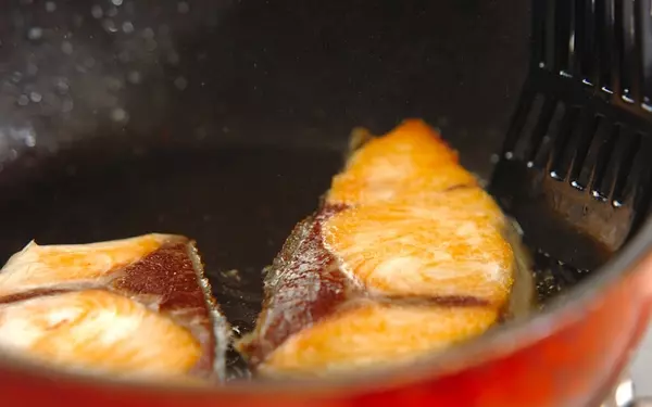 3、シメジを取り出し、ブリを入れてフライパンに蓋をして両面こんがりと焼く。途中油が足りなければ足す。