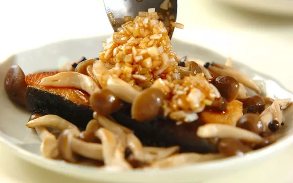 4、器にブリ、シメジを盛り、合わせた<タレ>をかけて糸唐辛子を飾る。