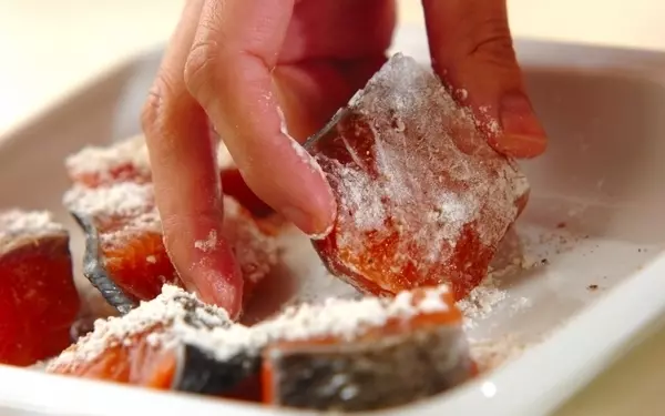 ・玉ネギはくし切り、皮をむいたニンジンとジャガイモは乱切りにする。鮭を1切れあたり3等分に切り、軽く塩コショウを振って小麦粉をまぶす。