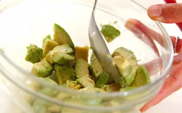 1、アボカドは縦一周切り込みを入れて半分に分け、種を取り除いてスプーンなどで身を取り出し、食べやすい大きさに切る。ボウルに入れてレモン汁とからめておく。