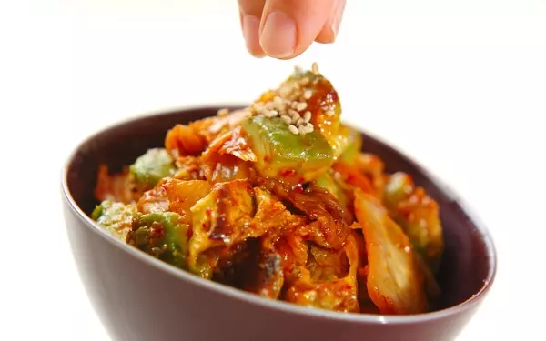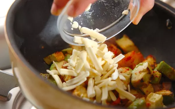 2、フライパンにゴマ油を中火で熱し、アボカドを加えておいしそうな焼き色がつくまで炒める。白菜キムチを加えて炒め合わせ、ピザ用チーズを加える。