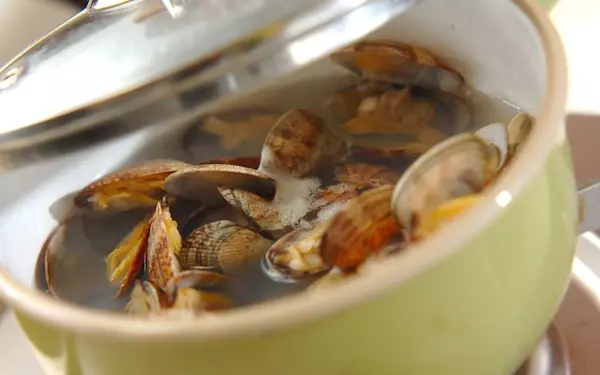 2、鍋にアサリと水を入れて蓋をし、火にかける。全ての殻がしっかり開いたら火から下ろし、そのまま置く。