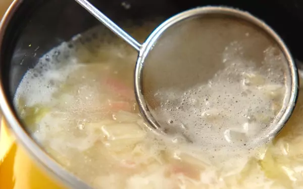 3、別の鍋を熱してバターをひき、ベーコン、玉ネギ、白菜の芯を炒め、玉ネギが透明になってきたら、小麦粉を加えてさらに炒め、(2)の汁を全て入れてひと煮たちさせ、アクを取る。