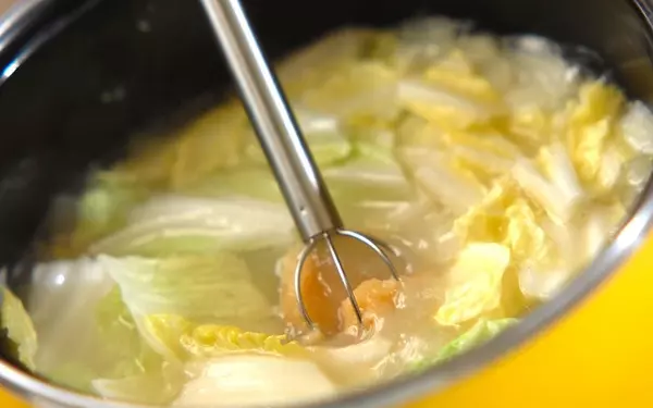 4、白菜の葉を加え、火を弱めて白みそを溶かし、牛乳と生クリームを加えてひと煮たちさせる。