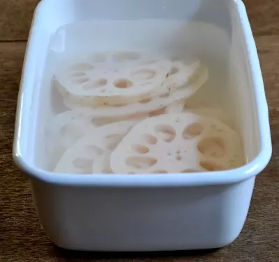 空気にふれると黒ずむので酢水にひたして保存します。れんこんが少しあまったときの保存におすすめ。2〜3日で使いきるときは、この方法で。