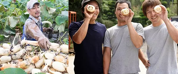 茨城県稲城市でれんこんの生産をしている「れんこん三兄弟」。