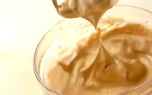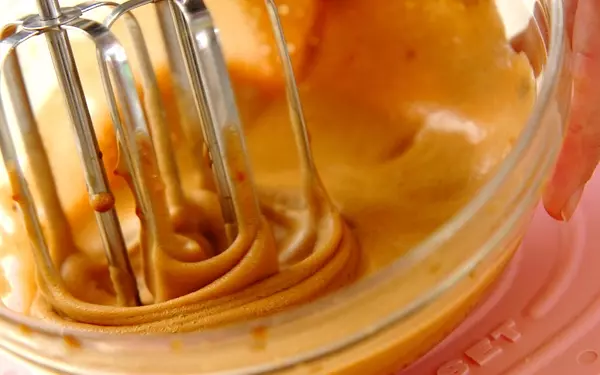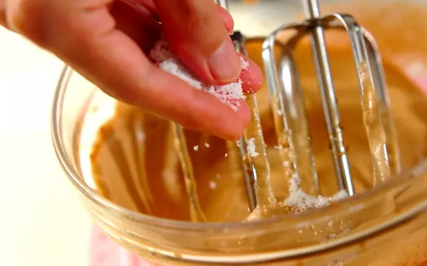 1、卵白にインスタントコーヒーを加えて10分置く。インスタントコーヒーが溶けたら、ハンドミキサーで泡立てる。