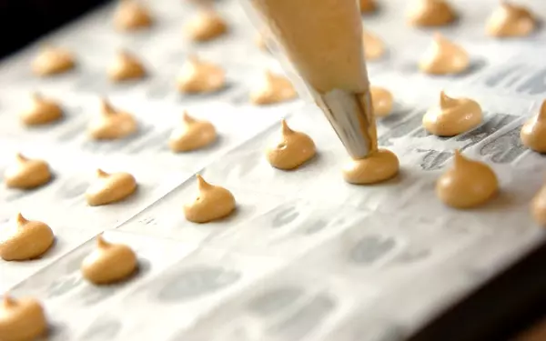 4、絞り袋に入れて2~3cmの丸に絞る。100℃で30分焼き、庫内に10分置く。
