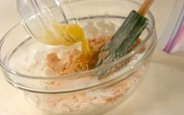 2、ボウルに(1)を入れて手で混ぜる。<粉類>の材料を振るいながら入れてサックリ混ぜ、三温糖、溶かしたバターを入れて混ぜる。