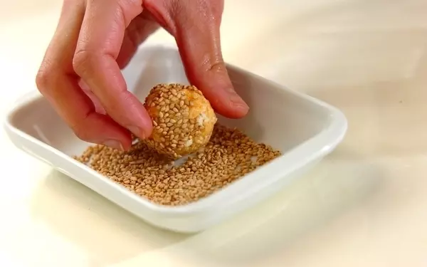 3、(2)をひとくち大に丸め、白ゴマを付ける。170℃に熱した揚げ油に入れて色よく揚げて油をきり、器に盛る。