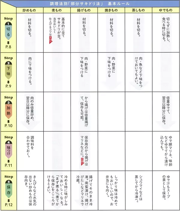 このように炒めものは途中まで「サキドリ」しておくことが時短につながりますが、煮ものは、いっそ最後まで多めに作ってしまう方が味もしみておいしいなど、どこまで「サキドリ」すればいいかは調理方法によっても異なります。下の表を参考に、自分に合いそうな時短方法をぜひお試しあれ。