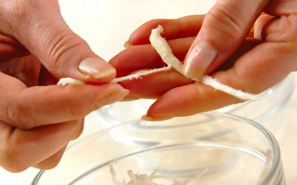 1、サキイカをさらに細かく裂き、キュウリは薄切りにしてボウルに合わせておく。