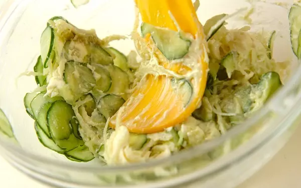 2、キュウリが少ししんなりしたら、クリームチーズ、練りワサビを加えて和える。