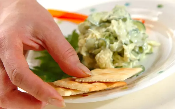 3、器に大葉をしいて(2)を盛り、クラッカーを添える。