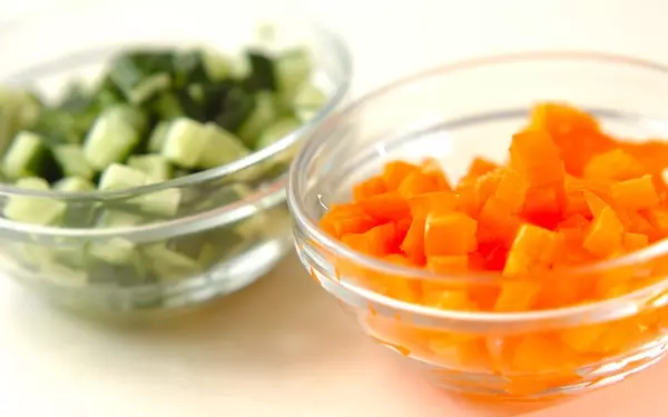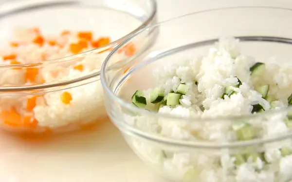 2、(1)のご飯を2等分し、キュウリとオレンジパプリカをそれぞれ加えて混ぜ合わせる。
