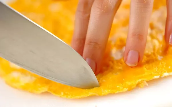 3、<薄焼き卵>を作る。フライパンを中火にかけ、薄くサラダ油をひいて溶き卵を流し入れ、大きな円形の薄焼き卵を焼く。粗熱が取れたら、ケーキ型の大きさに合わせて切る。
