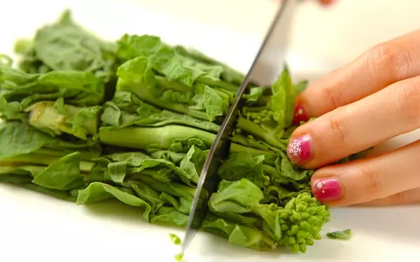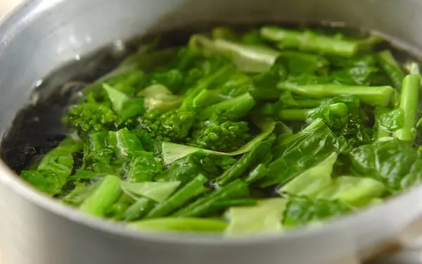 3、鍋にたっぷりの湯を沸かして塩16gを加え、スパゲティーをゆでる。袋の指定時間の2分前に菜の花とキャベツを加え、再び煮たったらザルに上げる。