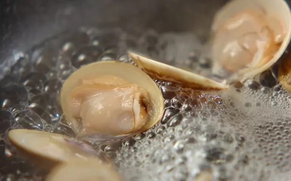 このレシピの場合は、ハマグリはじっくりエキスを出すために、弱めの中火で酒蒸しするようにゆでます。貝が開いたらすぐに取り出すようにしましょう。