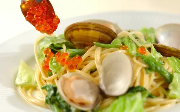 4、(3)を(2)のフライパンに加えてからめ、器に盛る。ハマグリ、イクラをのせ、お好みで粉チーズをかけていただく。