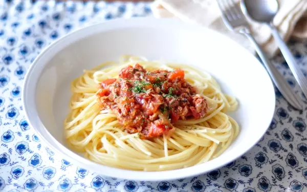 6、1%の塩を入れた湯で茹でたスパゲッティにかける。
