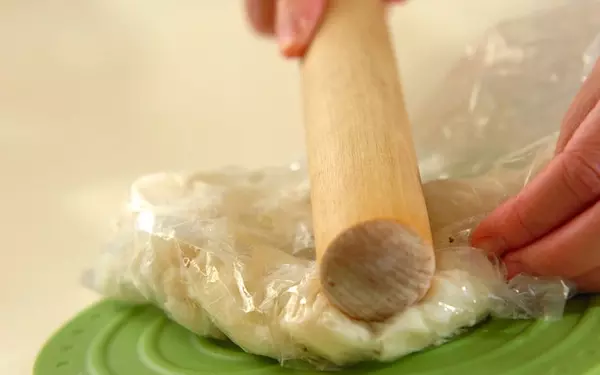 ・長芋は皮をむき、ビニール袋に入れてすりこ木などで少し粒が残っている状態までたたく。